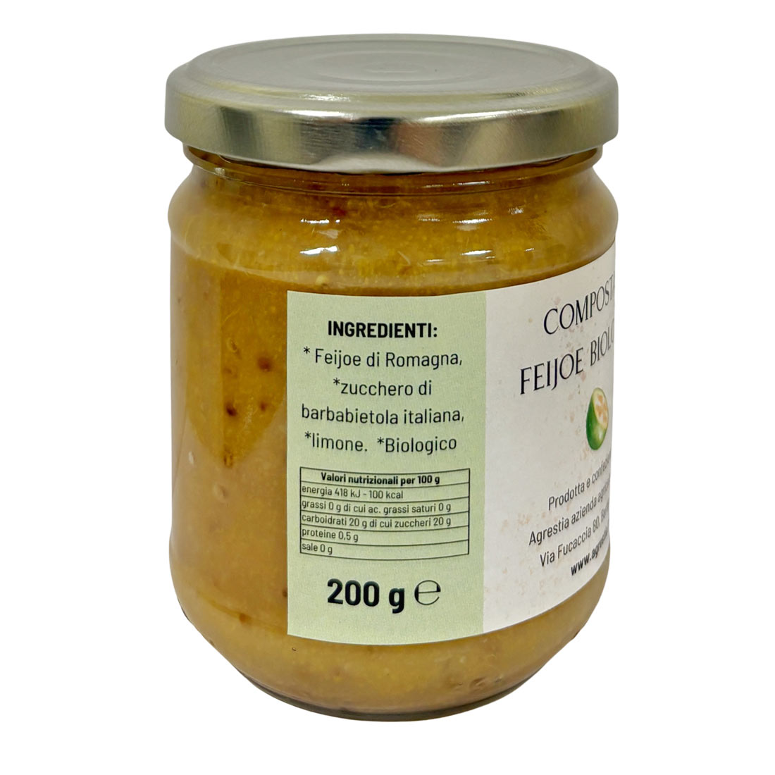 Nella preparazione aggiungiamo solo un pizzico di zucchero di barbabietola italiana biologico e di limone per preservare la conservabilità. Durante la cottura la composta non oltrepassa mai i 90 gradi, così da preservare il colore e il sapore del prodotto finito. Ingredienti: feijoe, zucchero da barbabietola italiana, limone. Confezione da 200 g.